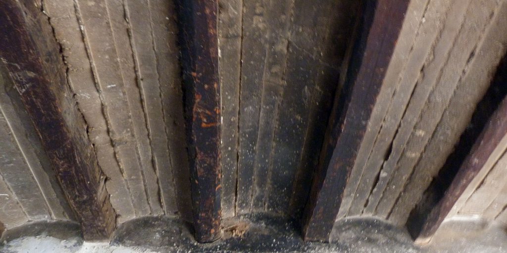 Para que el forjado se estable, es fundamental que exista una buena traba entre viguetas y revoltones. Cuando las viguetas son rollizos Piezas de madera utilizadas en construcción sin haber sido previamente trabajadas, por lo que mantienen la sección natural del elemento sin desbastar, esta conexión se consigue por la propia forma del madero. Sin embargo, cuando se emplean viguetas escuadradas Trabajadas en sus caras para que tengan una sección rectangular, es habitual que se practiquen hendiduras o se claven listones en los laterales de la vigueta para permitir que el yeso entre y trabe el revoltón. Aunque resulta menos común, también es posible encontrar casos en los que se giran las viguetas para formar superficies inclinadas sobre las que apoyar el arranque de los revoltones.