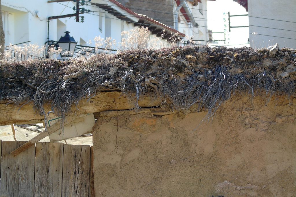 Al carecer de cubierta, las cercas de adobe se suelen proteger mediante albardillasCaballete o tejadillo que se pone en los muros para que el agua de la lluvia no los penetre ni resbale por sus paramentos realizadas con teja o ladrillo o mediante bardas, que son remates formados a partir de haces de ramas, paja o cañas que se disponen transversalmente al muro, volando sobre sus dos paramentos Cada una de las caras de un muro, de manera que forman pequeños aleros sobre ellos. Para evitar que el viento o la lluvia los arrastren, estos haces se fijan por gravedad colocando sobre ellos cespedonesFragmento arrancado de un suelo de pasto, de manera que mantiene la capa vegetal y una pequeña porción de tierra, fijada por las raíces o caballones de tierra sobre los que se deja crecer la hierba.
